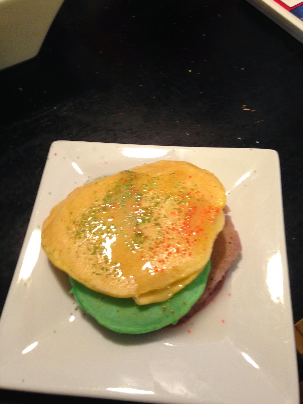 Be careful not to overcook the pancakes or the brown will overtake the color inside. Then stack them in alternating colors and pour over the glaze listed in the blog I linked to (basically powdered sugar, lemon juice, and water) and add some sprinkles to finish the look! I didn’t have any purple sprinkles so I subbed in red 🙂