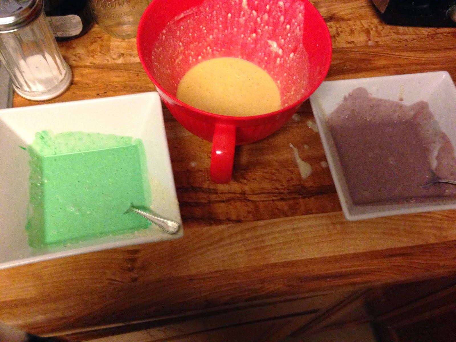 My inspiration for these pancakes came from this blog. I tweaked the recipe though, especially because after those biscuits I made a while back that I didn’t like, I was dead set against using bisquick as part of the recipe. So I pulled from a few pancake recipes to create the basic pancake batter (I got creative since I didn’t have buttermilk). Basically you start with your regular pancake recipe (or mix if you so desire) and split the batter into three different bowls, using food coloring to create those fabulous Mardis Gras shades