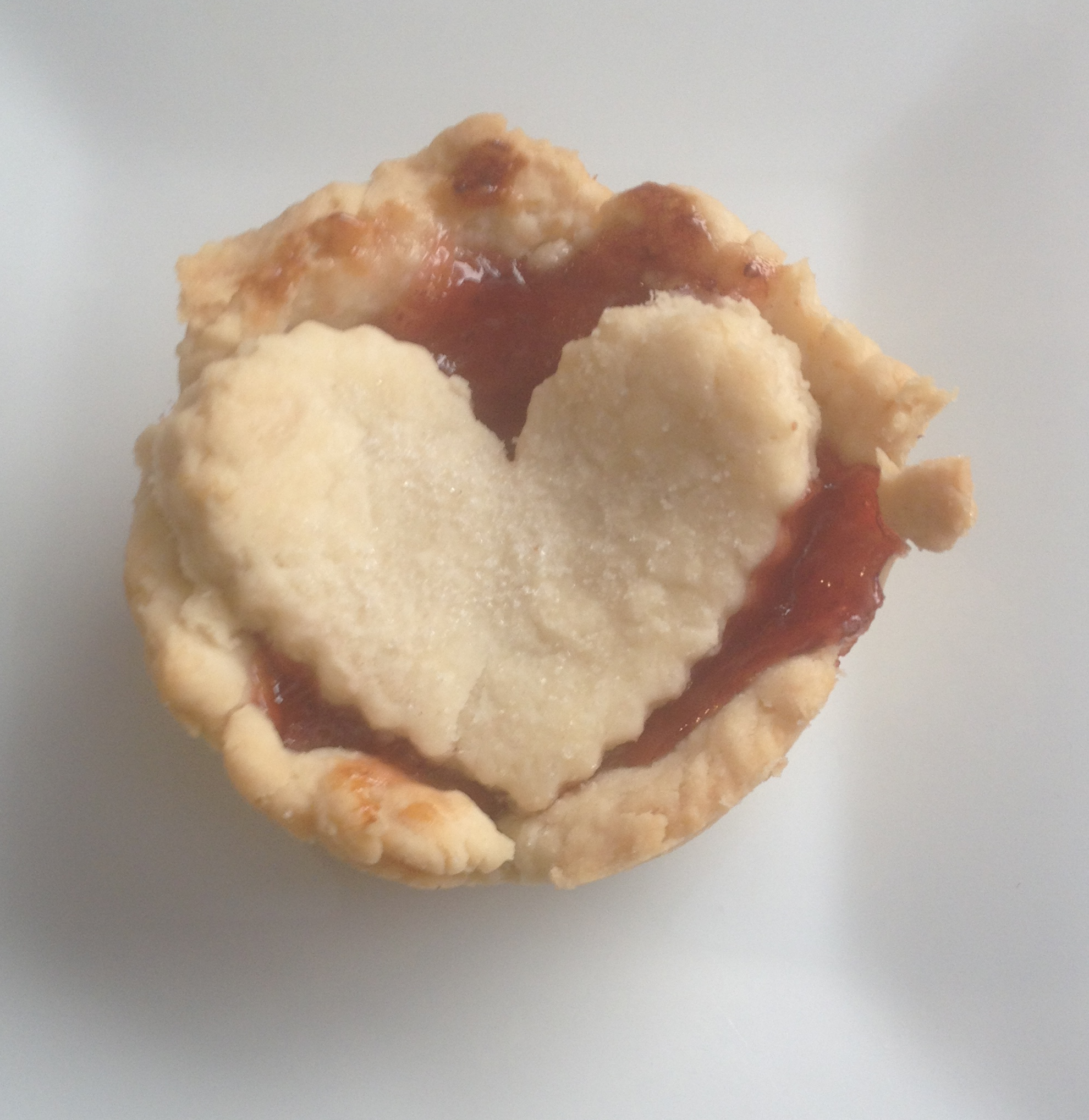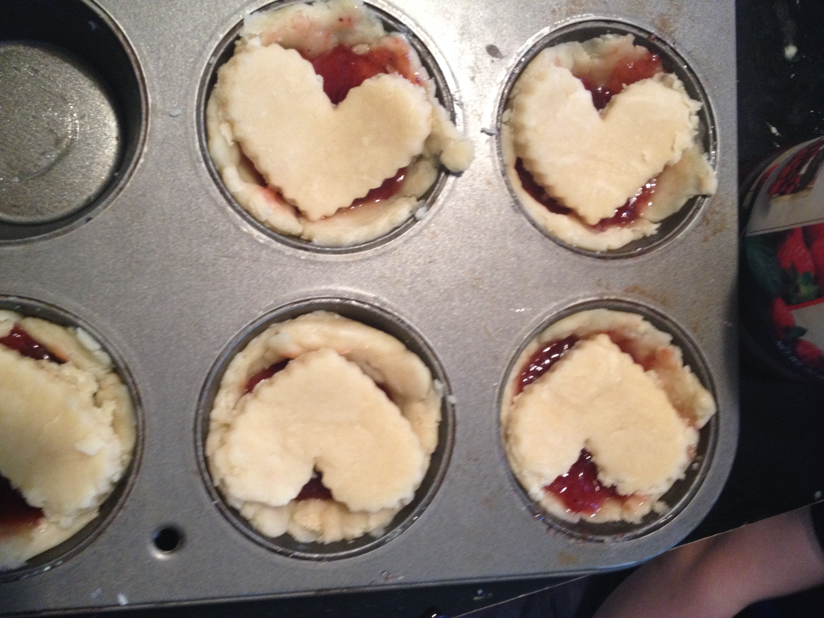 Of course, my nephew didn’t think it counted as real baking unless he got to roll out some dough, so we made some Jelly tarts- also super simple. I learned from my pie attempt that I could probably make a simple crust with a few cups of flour, a stick of butter, and a few tablespoons of milk or water- and a dash of sugar of course!. We then filled them with different kinds of jams. They were a great sweet companion to the peanut butter cookies. Just to make them extra pretty we cut some heart shapes out of extra dough: