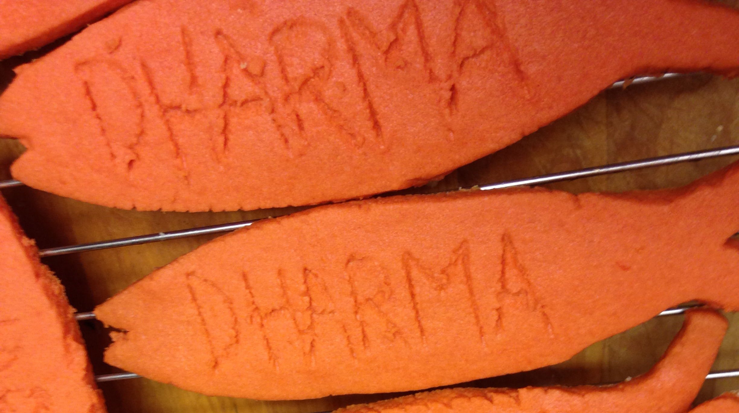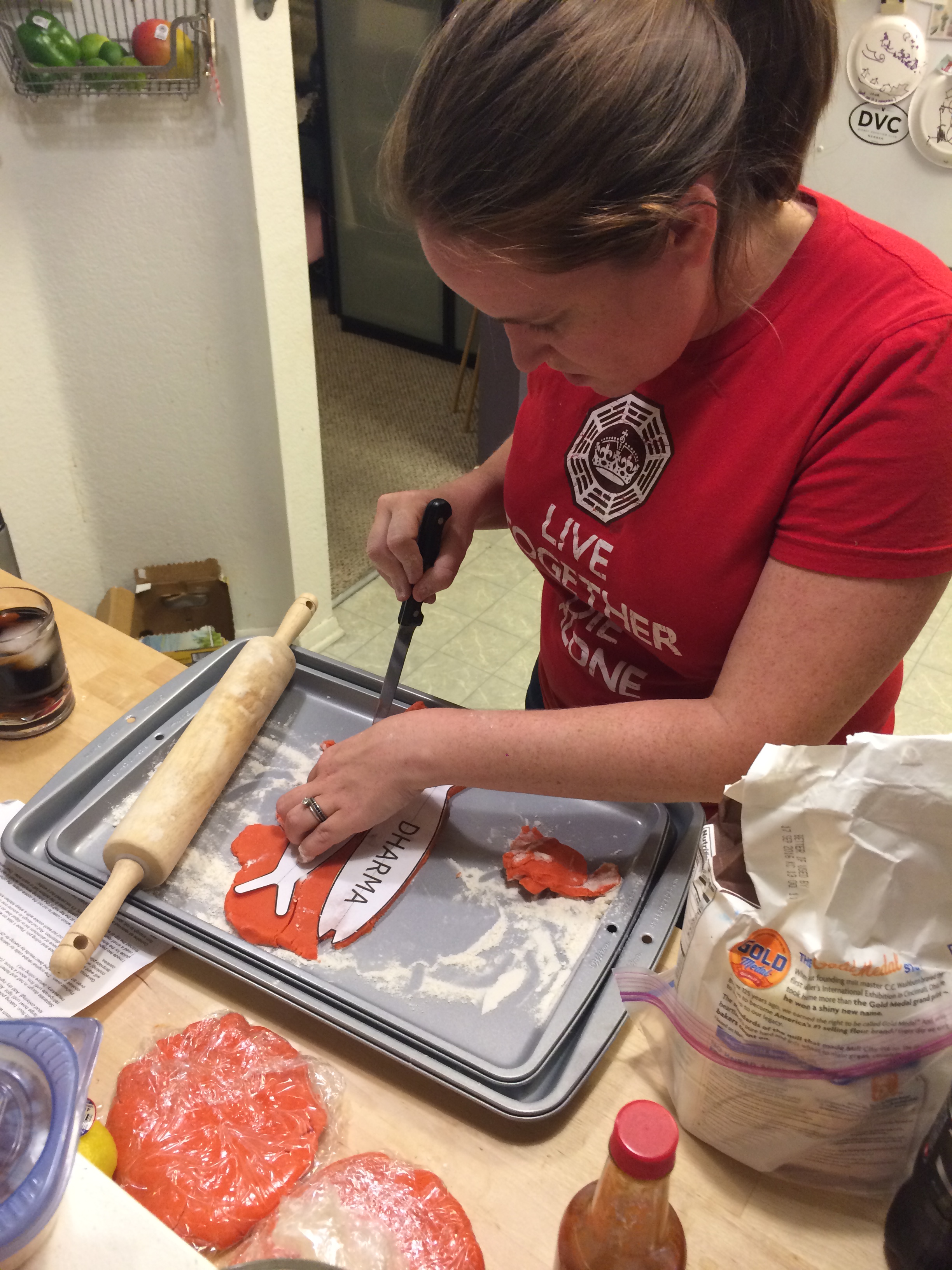 With the consistency of the dough you will need to divide the dough into patties about the size of your hand and put this in the fridge for a few hours before rolling it out and cutting shapes. If you doubled the recipe like we did, you will probably want to keep a few of the discs of dough in the fridge while you roll out the others or the shape will not come out as clear. (again if you are not making fish biscuits you could still cut out the dough in some heart patterns or letters or whatever your occasion may call for) We carefully cut out our fish pattern using the template in the link above, then I called in back up for carving the DHARMA letters since my handwriting leaves something to be desired on paper, let alone pastry.