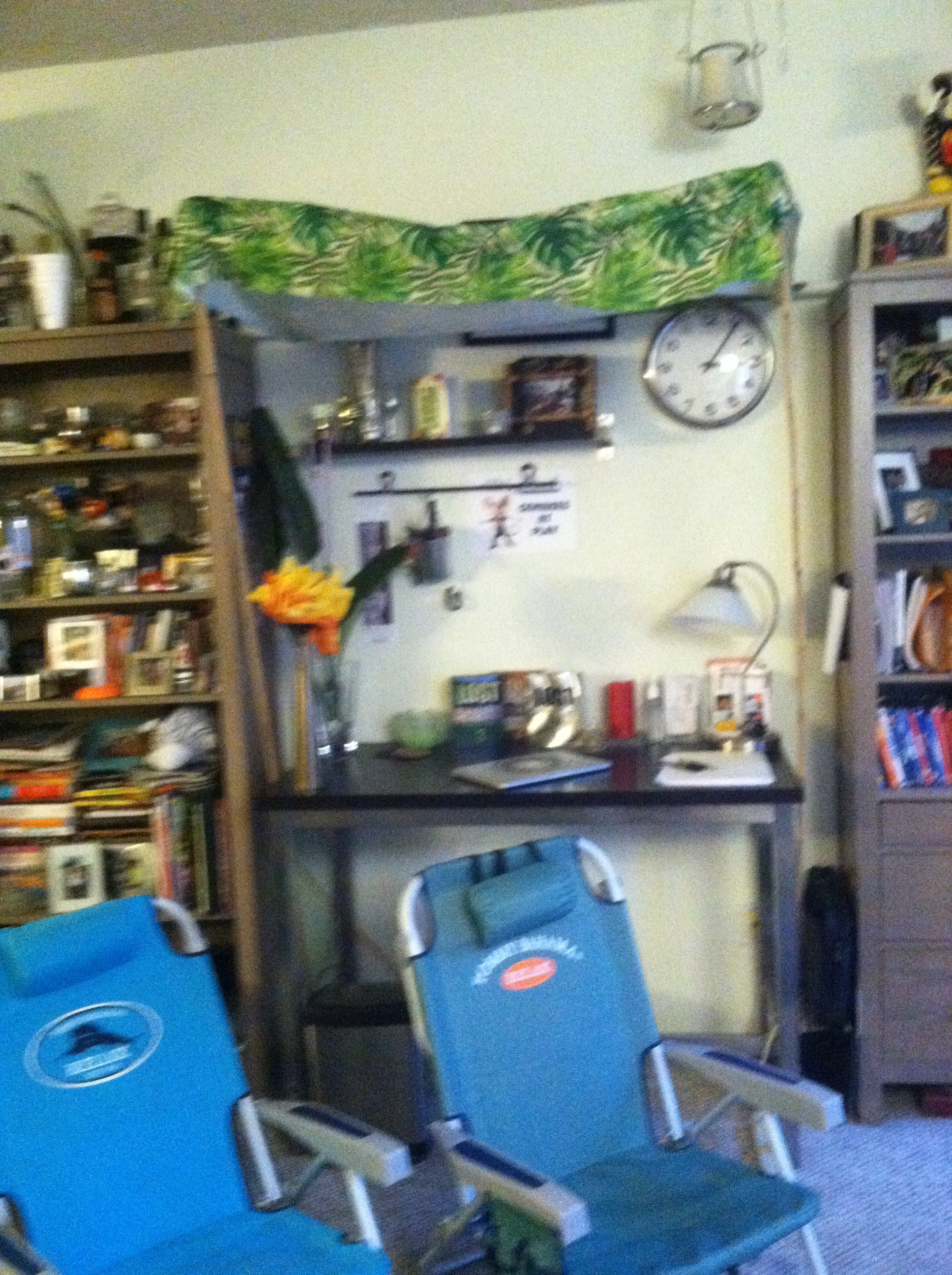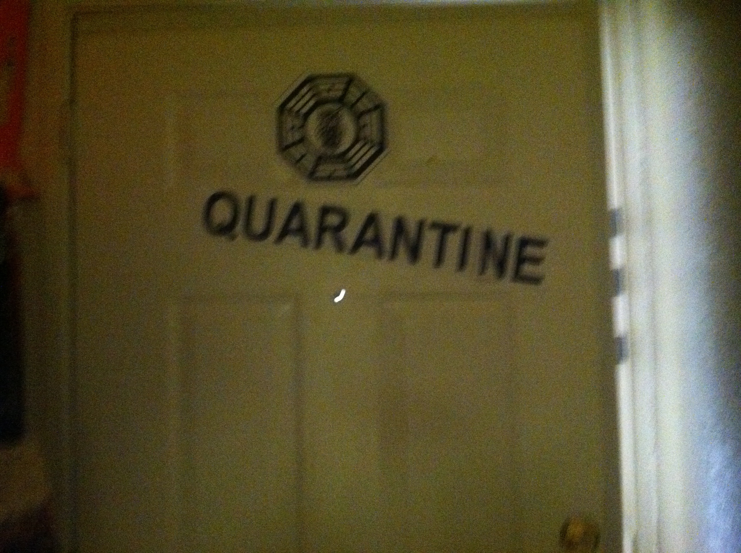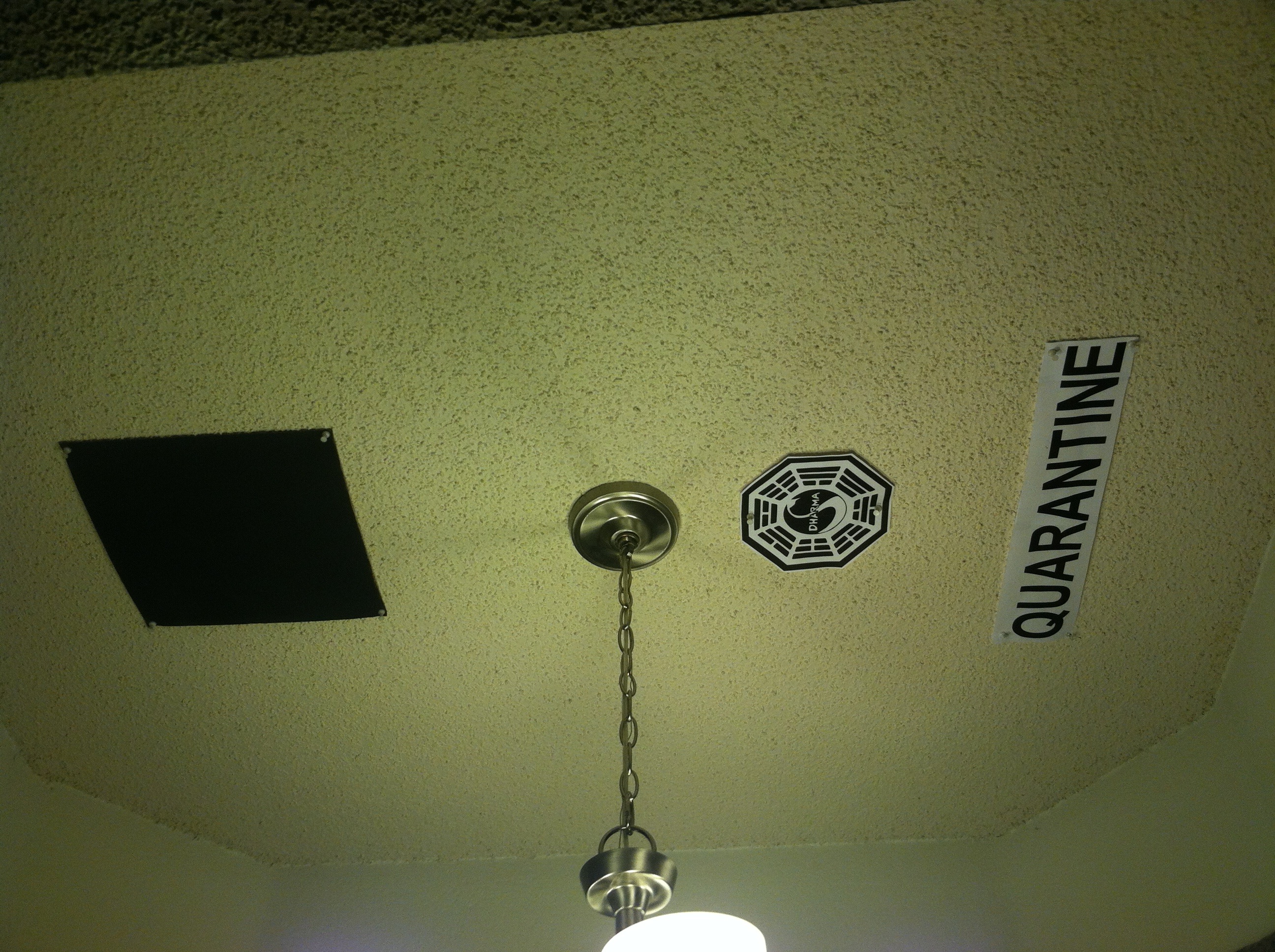 It’s hard to tell from this picture how awesome this decoration was- there was a small lofted area of ceiling above their dining room table which they decorated above the light to look like the top of the hatch. It was many people’s favorite piece of theming.