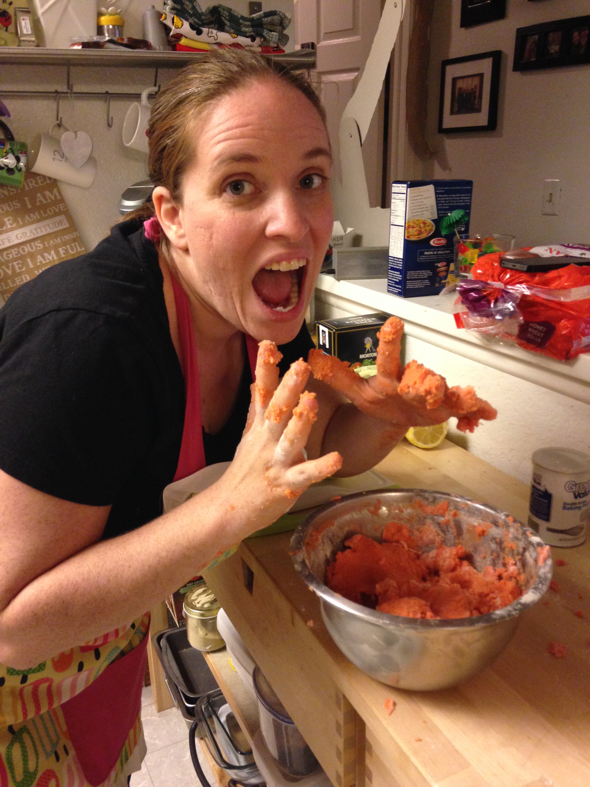 The recipe was based on this Fish Biscuit idea, so check the link for the exact ingredients, but I added some of the citrus juice with the zest for a little more kick and a bit of a softer cookie when they first came out of the oven. This is a time intensive recipe as well. In fact, it was time intensive enough that we started this project two hours before the party and I was still working on it after dinner was finished and the LOST watching started. For this recipe you start with two mixing bowls- one for the buttery goodness and one for the rest of the dry ingredients. The key to getting the color right is keeping the dry ingredients separate until after you’ve added your for coloring to the butter mixture, so whatever color you make that mixture, know that you are going to get something just a shade lighter at the end. Also, it gets messy, which is part of the fun right?! It was probably a little more crazy because we were trying to mix with only one beater in place… adventures in cooking new places!