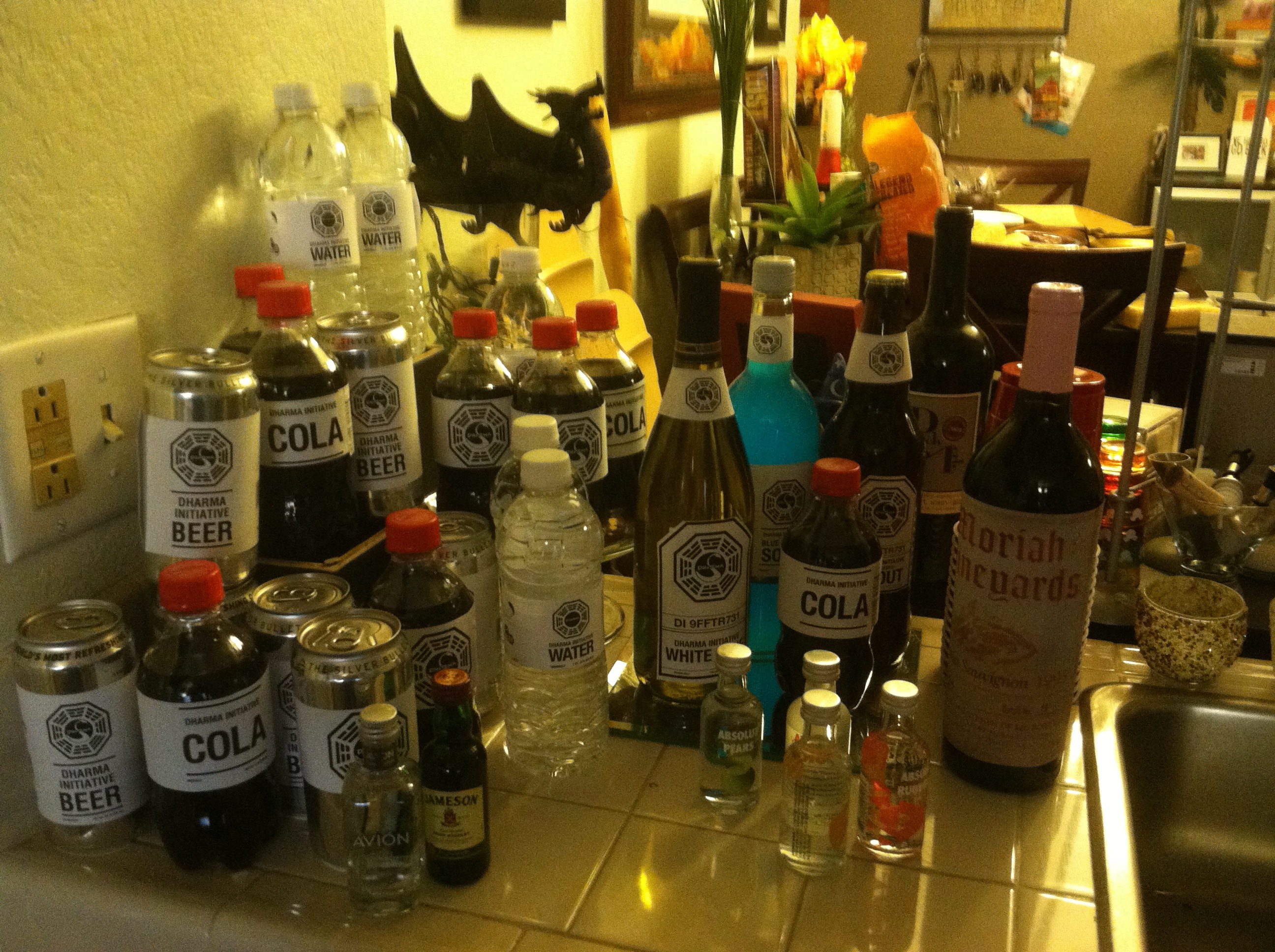 An amazing bar setup is key to an awesome party. This one is complete with DHARMA soda, wine, beer, water, mini bottles from the plane, Moriah Vineyards wine (Desmond’s monastery) and MacCutcheon Whiskey (Mr. Widmore’s drink of choice)