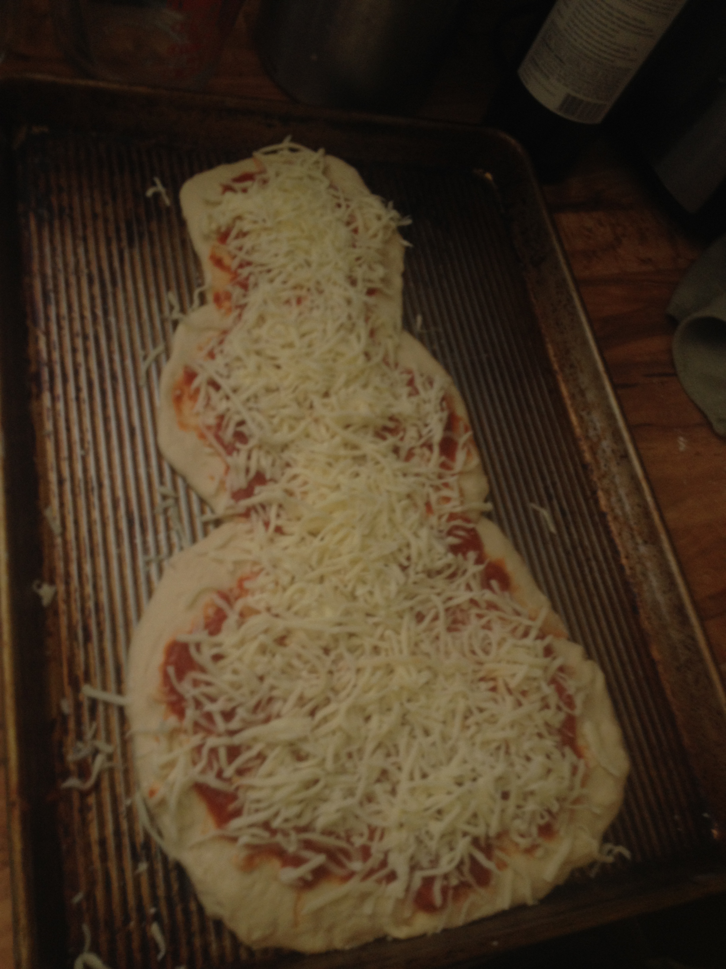When it came time for lunch I knew just what to do. I’d been wanting to make homemade pizza and blog about it for a while and since we were having christmas in June I thought- SNOW MAN PIZZA! I found a super simple recipe for pizza dough that didn’t require sitting overnight or a very