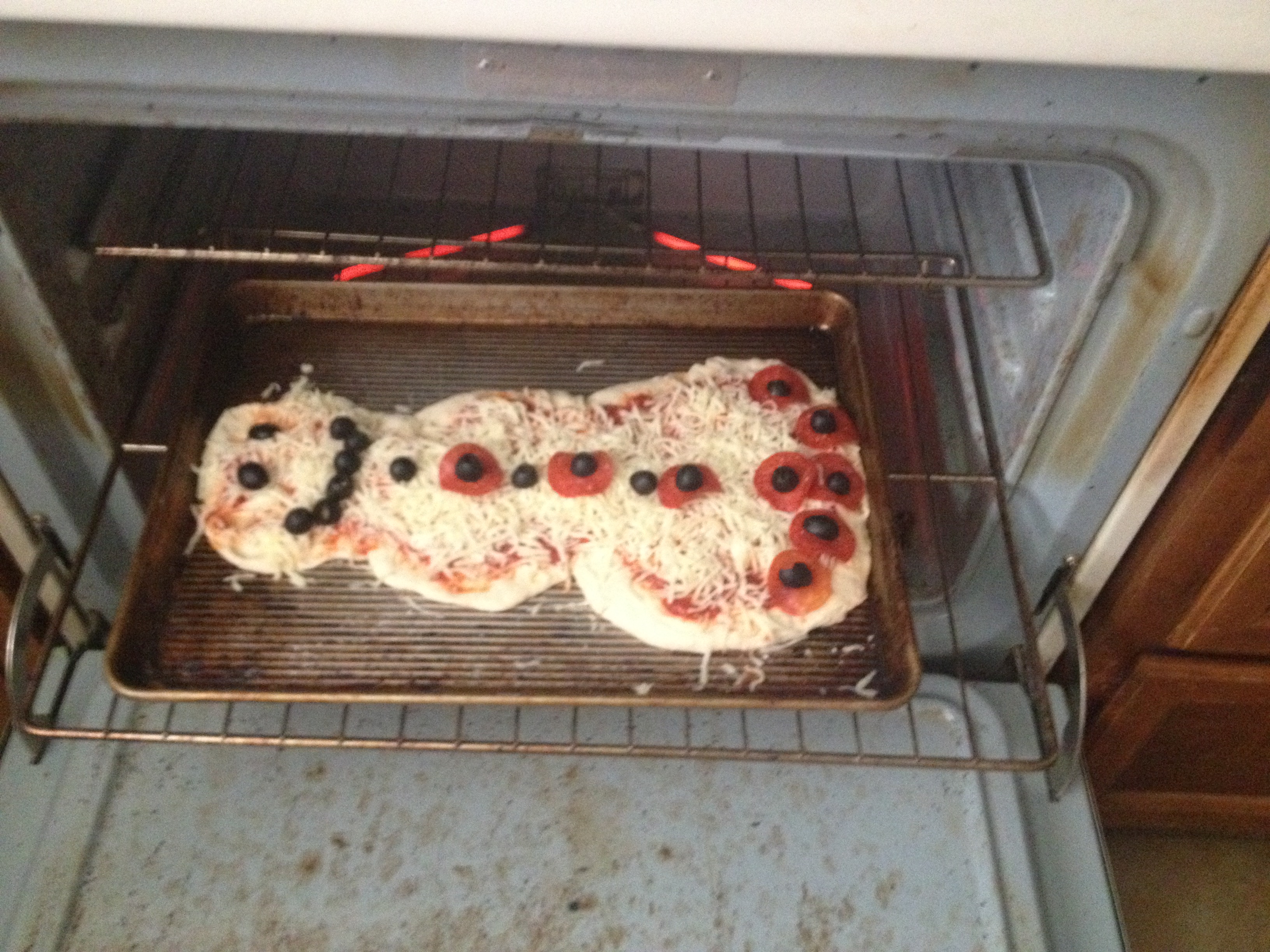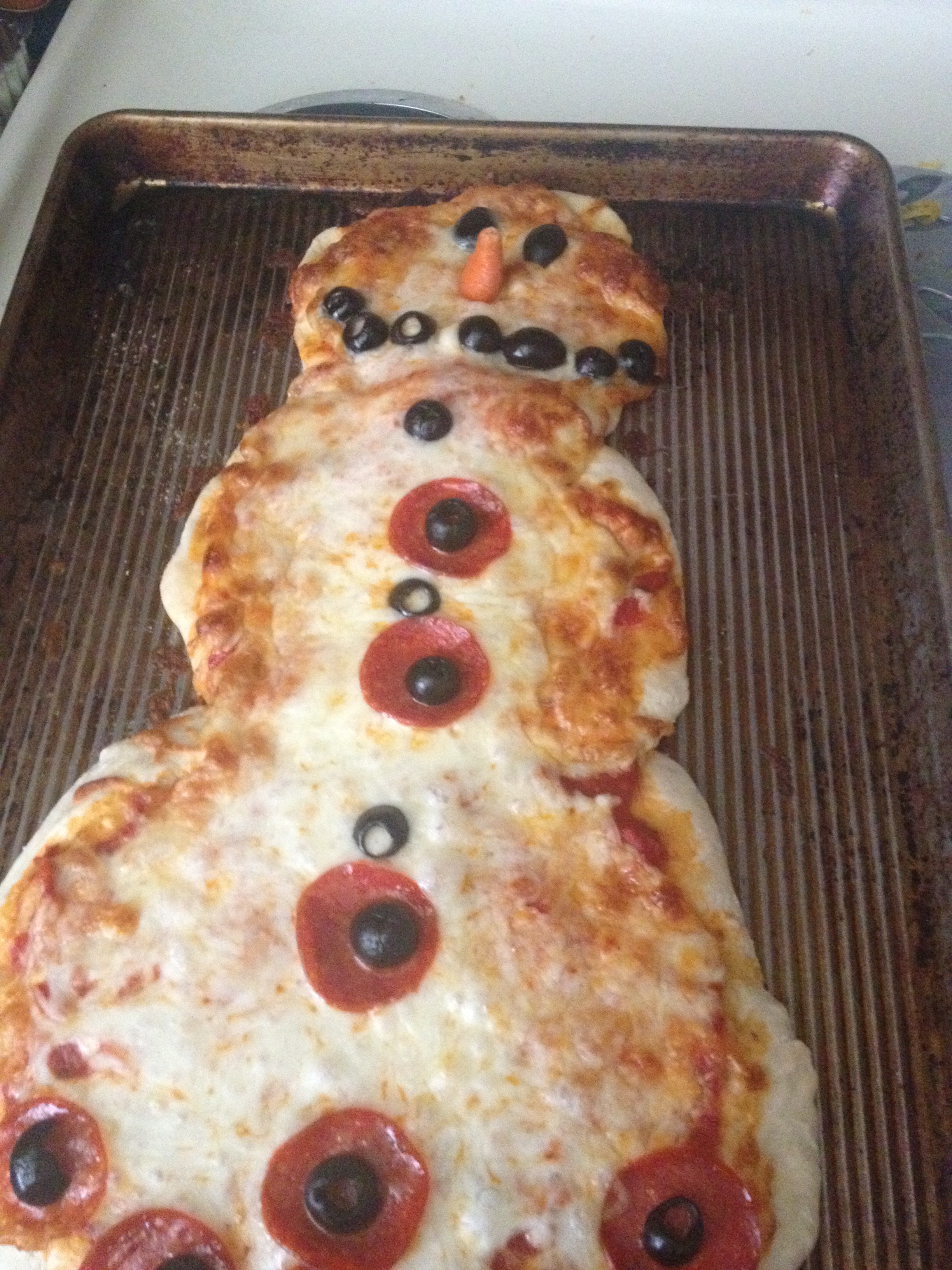came the fun part- decorating! We would usually add more veggies, but we didn’t want the white “snow” of the cheese to be too covered with other things. My nephew made up for it with lots of pepperoni and olives which are his favorite topping of the day (it was different last week so who knows when that will change again) We baked it a little less time than the recipe called for and then added a carrot nose at the end. Then we tried very hard to be patient to wait for it to cool enough for us to eat without burning our mouths. It was a hard wait!