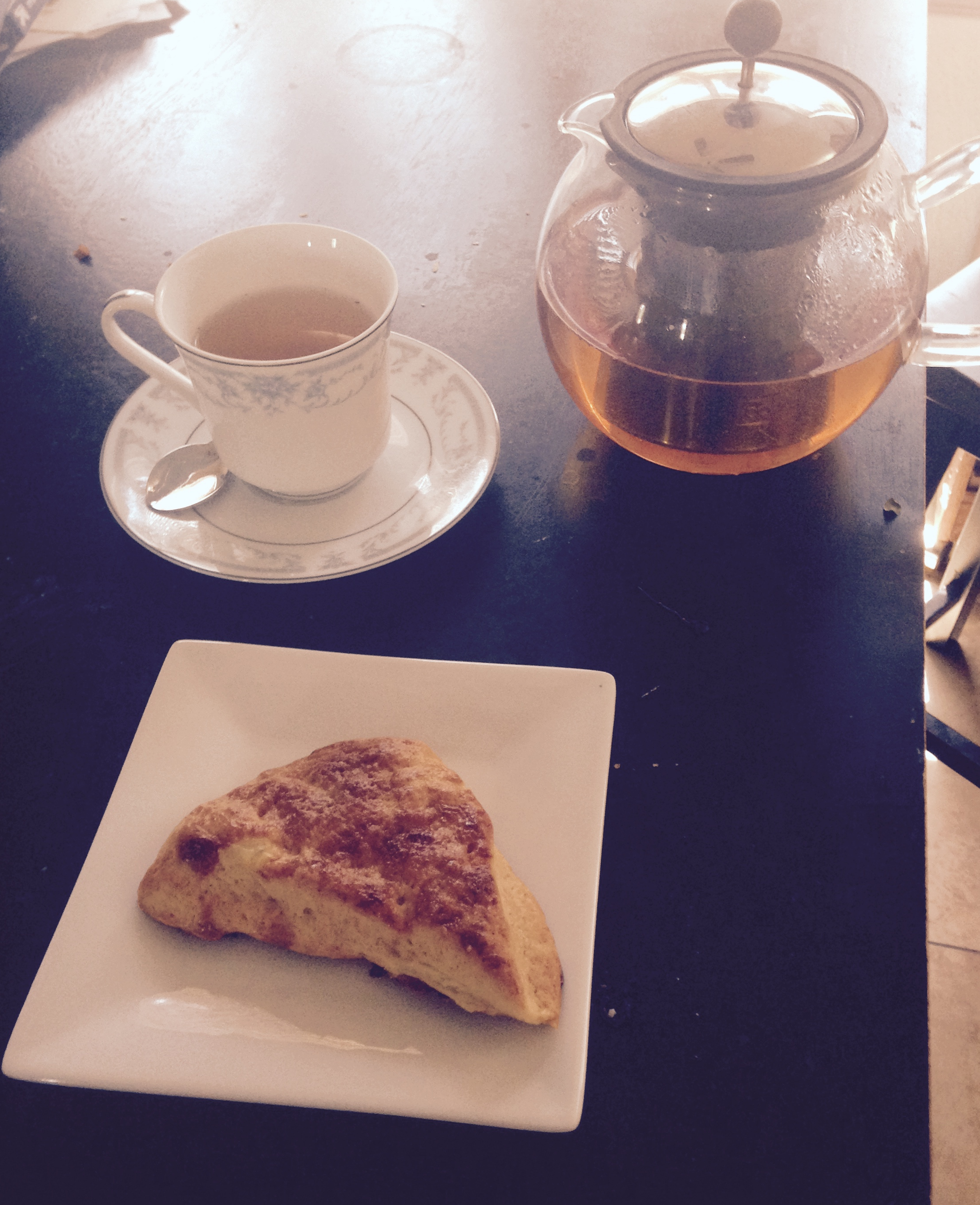 There is something ritualistic and comforting about tea. I mean don’t get me wrong, I love my coffee in the morning (and… afternoon… and evening…) but tea just has a peaceful effect. Maybe it has to do with the ritual I mention. I usually drink my coffee black unless I’ drinking espresso. Tea, I usually add honey or milk or I go through the time of using loose leaf blends and allowing the tea to steep before the next step can happen. It’s beautiful. And just as the ceremony of tea requires waiting between steps, so did this recipe for scones. I started working on them Tuesday night after I got home from tutoring (lucky for me my husband made a grocery run to pick up the missing ingredients) and then the dough needed to sit overnight in the fridge before I could move onto the next step in the morning. I have to say, I think the anticipation made them taste even better.