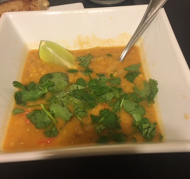 This soup was such a winner. The only changes I made to the original recipe came out of an accident- I bought full fat coconut milk instead of light so to compensate for how much that mellowed out some of the spice I used both curry paste and curry powder. It was so delicious and the combo of chickpeas and lentils was satisfying. Be sure to add plenty of lime juice and have some cilantro on hand to top your bowl! And if you have the opportunity to have a sous chef help you prep in anyway- take them up on the offer. Accepting help can make your meal that much more delicious. Now if only I could get better at doing that outside the kitchen!