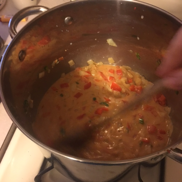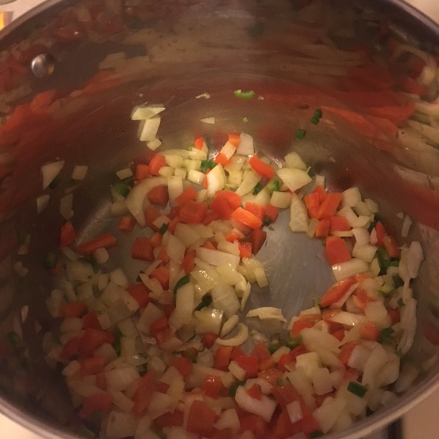 kitchen with everything prepped and I got to do the fun part of hearing the vegetables sizzle when they hit the bottom of the soup pan with some hot olive oil. I got to watch as the soup changed and more complex aromas rose out of the pot. I had the joy of watching my husband come back in, his eyes widening just a little, and tasting before asking how much longer it had to simmer.