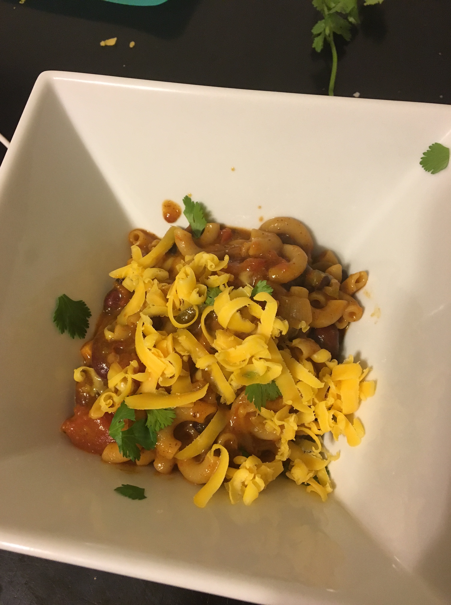 I will be honest… I prefer my chili made in the crock pot and cooking all day long so all the flavors come together and meld. Still, I have to admit that this was fast, easy, and great for nights you forgot to start thinking about dinner until almost 6 pm! (An event that definitely happened tonight as a side effect of dance parties with your little one and choosing small things that induce happiness instead of focusing on my to-do list, so I’ll take it.) If you make this, PLEASE heed the warning about stirring often once you add the macaroni… It started sticking to my pot even during the short time it took me to grate the cheddar cheese so I’m glad I didn’t try to step away from the kitchen while it simmered.