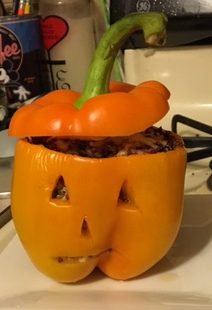 The key to the Jack O Lantern faces is to cut them BEFORE stuffing and cooking the bell peppers. The peppers get soft afterward. If you wanted to be super specific, I suppose you could use all orange peppers, but we wanted the variety and my son actually ended up wanting the yellow one more than the orange one! (maybe because my husband thought it would be funny to make one of the bell peppers look scared instead of happy and that was one of the orange ones?)