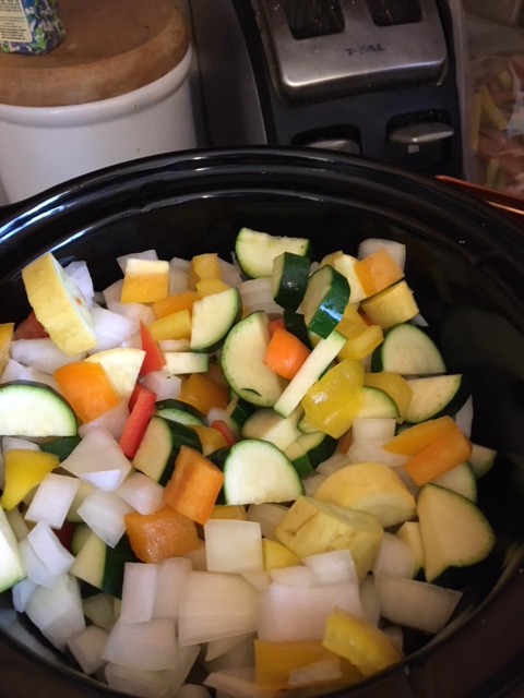 1. Ratatouille: OK, this is by no means a new recipe for us. In fact, it is one of our favorite standby recipes and what our crockpot is used for the most in our house. I will admit that we by no means make traditional ratatouille. We use a large variety of bell pepper colors and we omit the eggplant (I have a texture thing with it, same as with mushrooms which is unfortunate because eggplant and mushrooms are big in the world of vegetarian recipe substitutes…) Still, it remains one of my favorite comfort foods. The way all the flavors meld together into a warm perfect harmony… and the bed of hot buttery rice we serve it over is just a wonderful bonus. We have a recipe we use as a jumping off point, but over the years my husband and I have really made this recipe our own and mix it up based on which veggies we have around the house (such as the yellow squash this week). As long as you have a good tomato base to help it all mix together and a good dose of basil it tends to turn out just fine.