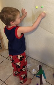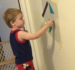 ~Make your own Mural on Contact Paper: you can get contact paper at the dollar store. Simply tape it up to your wall sticky side out, peel back the covering to reveal the sticky part, and then let your kid go wild sticking things “on the wall”- I use pre-cut shapes because that is what we are reviewing right now, but we have also just given my son pieces of paper to tear up in different sizes before and that seems to be just as much fun. You can add in other fun sensory items too like puffy balls or googly eyes which I sometimes pick up at the dollar store as well. You can even grab random lightweight household items like cupcake liners- my son loves the really shiny kind. The key is not to put out too much at once so that EVERYTHING ends up on the contact paper instead of some pieces scattered all over the floor. That way, when you’re done simply take the whole thing down and into the trash it goes as one single piece.