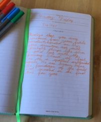 The journals contain verses of scripture to look up and then you literally just write those pieces out into the journal so that the muscle memory and physical act of writing helps the verse sink in more deeply than it might otherwise. I love that I can use whatever translation of the Bible I want and sometimes vary it up but most often use the USCCB readings online so that it is the same translation I read with my daily Blessed is She devotionals. The back of each page has a journaling section for you to reflect in some way. I actually break up each journal entry into two days. I writethe passage on the first day and then the next day I go in and underline or highlight or add arrows and hearts and stickers to places that particularly stand out and speak to me in this moment, at this time, after I’ve had a day to think about those verses. I then use the “on my heart” page to journal about prayers or how the verses speak to where I am or even to just write how I’m feeling that day. The journal is very flexible though and I recently saw a fabulous idea about using the journaling page as a place to write letters for their children and I am definitely debating doing that in a different volume (there are five, all themed differently- hope, gratitude, joy, faith, and renewal which is the one I am currently working through!)
