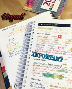 My running to do list is kept in my planner. If you’ve read Sean Covey’s book The 7 Habits of Highly Effective people, you may remember his chart about things that are Urgent (must get done soon) vs. things that are Important (what really matters in the long run. Some things may be both urgent and important or neither urgent nor important, but many fall in one category or the other and we can have trouble identifying those sometimes. My to-do list has the URGENT, time sensitive stuff, some of which is important, some of which is not. My power sheets has my IMPORTANT stuff, some of which may not seem so urgent. Here are some examples: